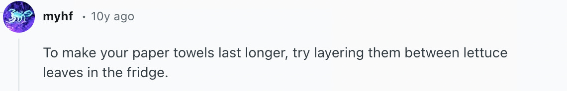 You mention lining your Costco bin with paper towels in an attempt to forestall decay. This is a reasonable approach, though about fifty percent of the Internet suggests that the best place to put these prophylactic towels is on top. A small but vocal percentage of the Internet tries to split the difference by layering paper towels between every layer of lettuce—something I’ve done myself, with herbs, when they were for a high-ticket-price fundraiser. My favorite variation on this theme, well explored on the spirited terrain of reddit, is from someone called myhf, reprinted below.